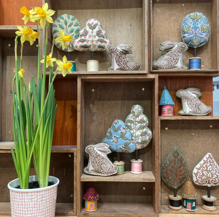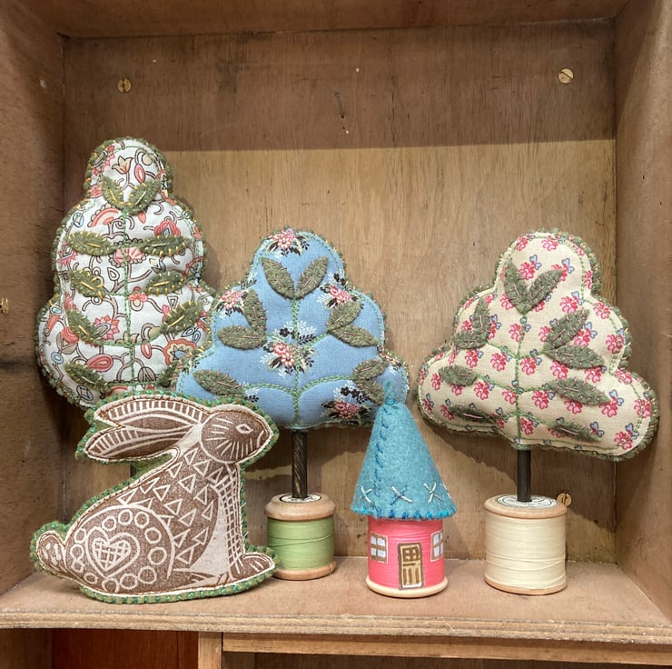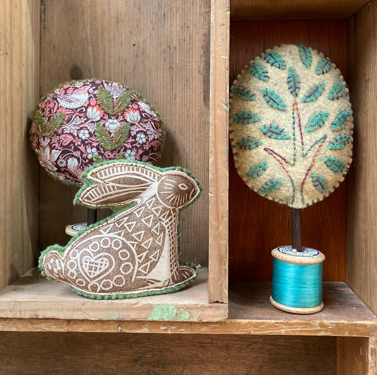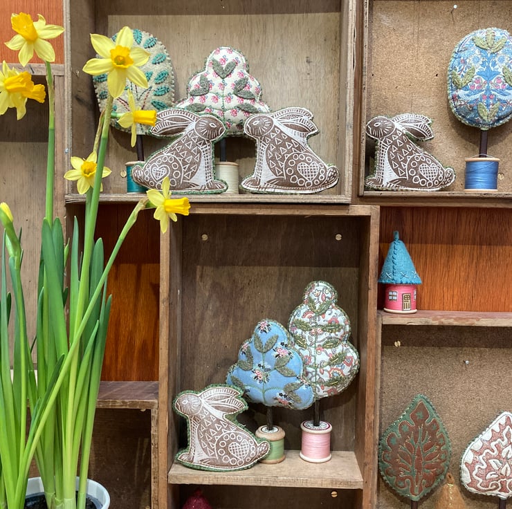 Inspired by Enid Marx, Edward Bawden and Staffordshire pottery. I love lino printing and have recently found the best printing inks and way of making these figures stand up for themselves, independent hares! They have a lovely mid-century feel to them and sit very well with my trees (if you don’t think about giant hares and scale of course)