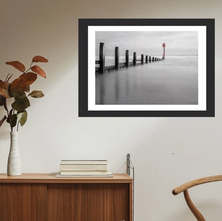 Photographic print of one of the many groynes along the beach at Redcar. I chose this one because of the bright red marker at the end. Taken with a long shutter speed to show movement in the waves I decided to convert this shot to black & white but left the marker with its lovely red colour.