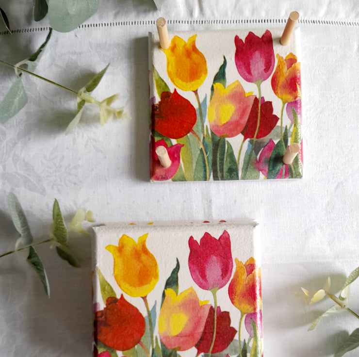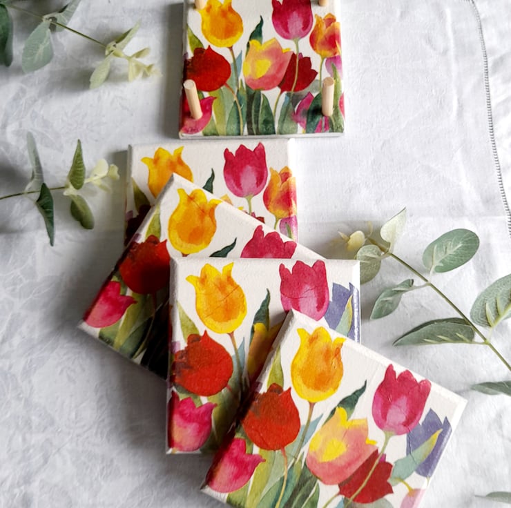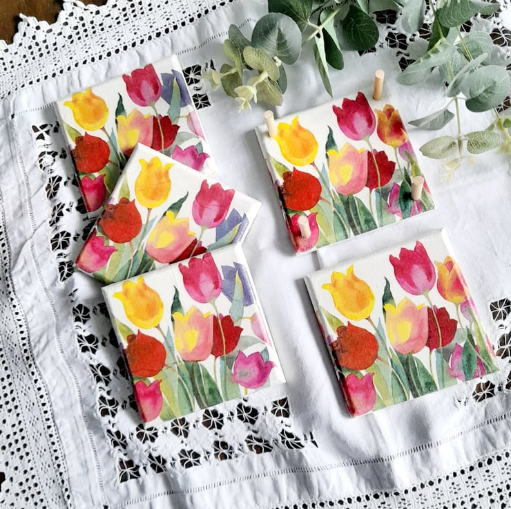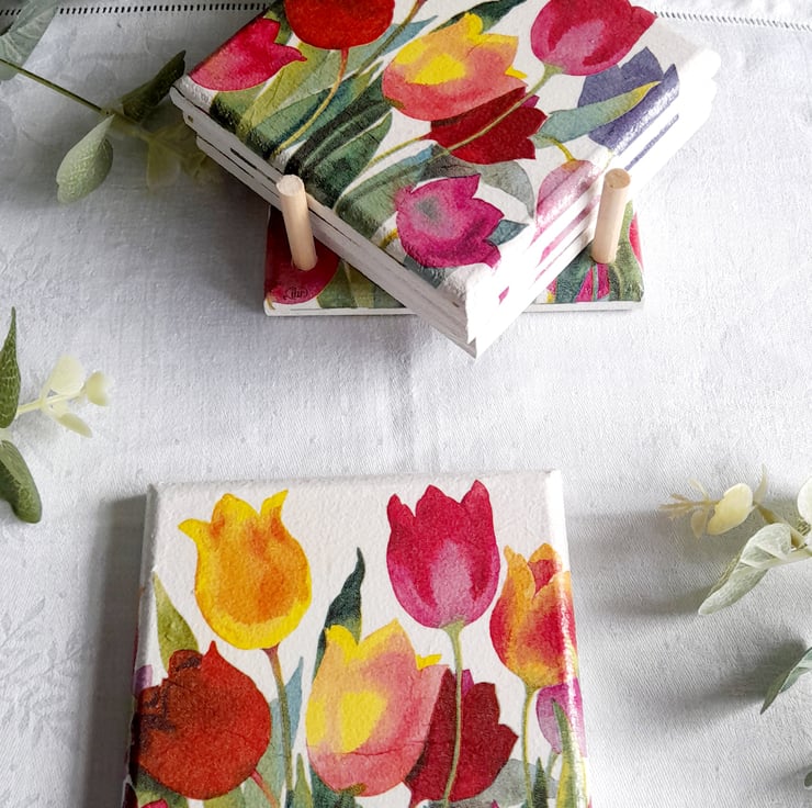 Beautiful Spring Tulips decoupaged onto a lovely set of 4 Coasters with a matching Coaster Stand.