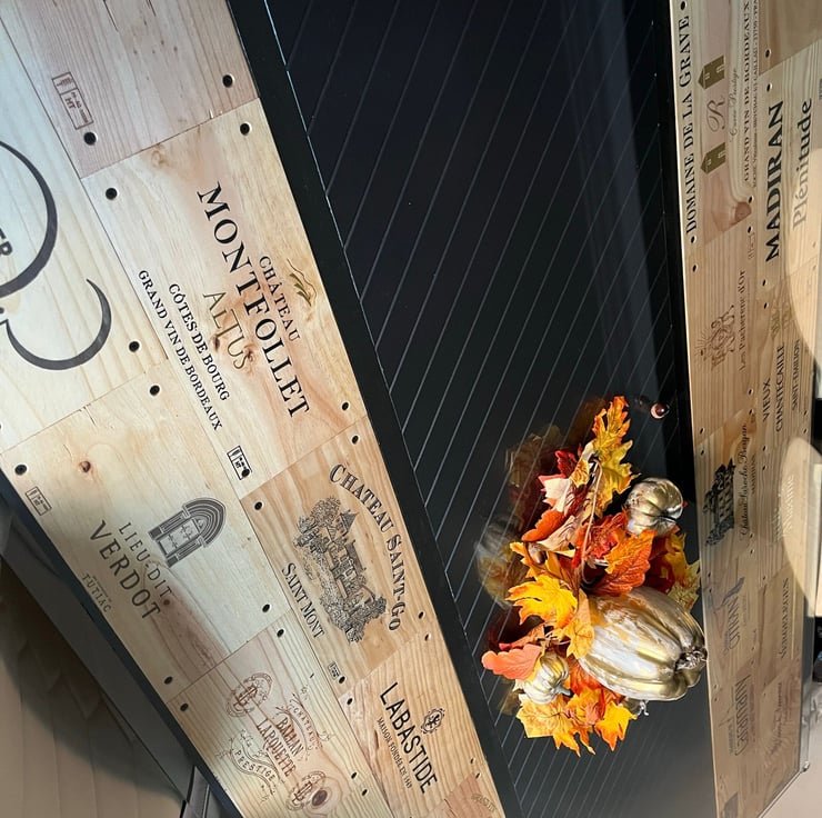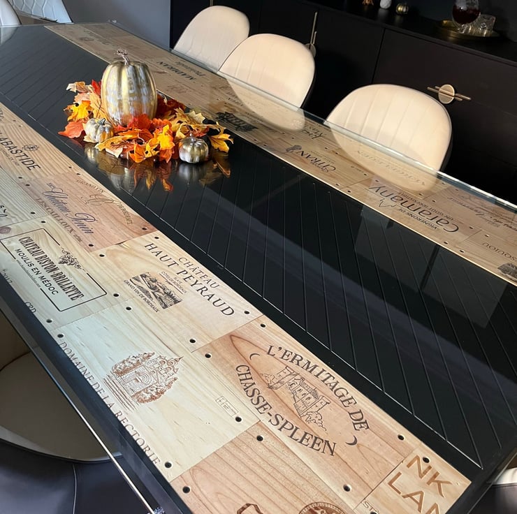 This luxurious dining table is the perfect addition to a wine enthusiasts home. It is adorned with hand picked wine crate logos from various regions including France and South Africa.