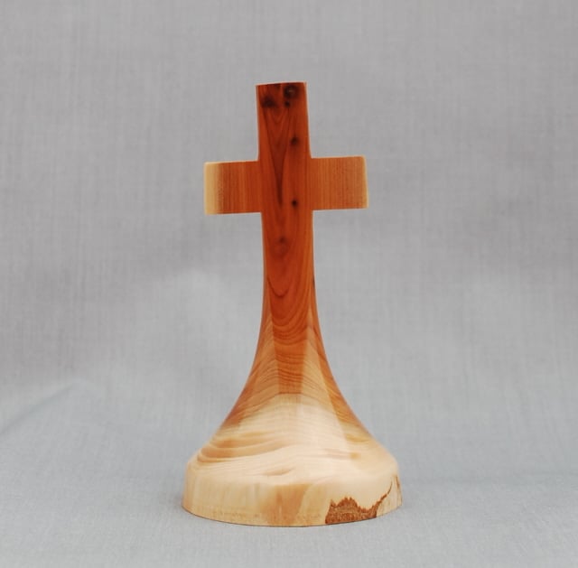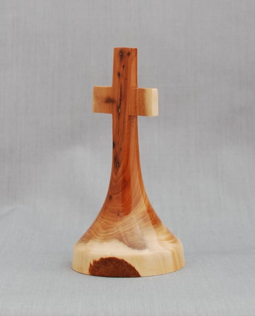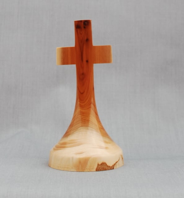 This Christian symbol has been hand turned by Randal from a fallen branch of yew growing in our garden. The meaning behind this Christian symbol is profound. The palest cream is nearest the bark, with the deepest rose colour is in the heart of the branch. This cross stands 10.5 cm high with a base of 5.5 cm approximately.