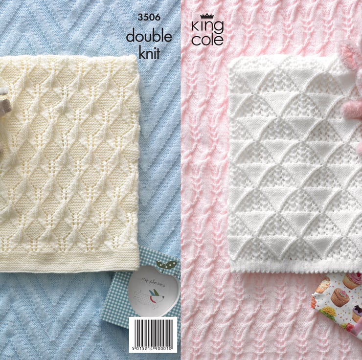 Instructions for 4 Baby Blankets are included in this King Cole double knit knitting pattern.