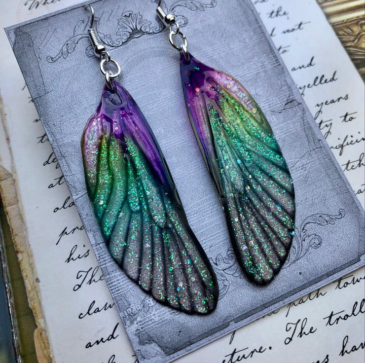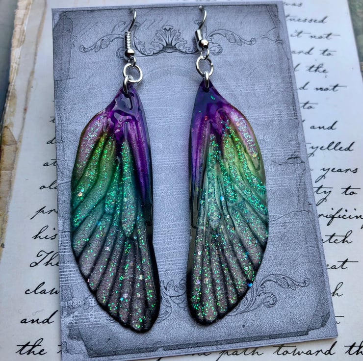 These magical fairy wing earrings measure 80mm from the top of the sterling silver hook to the tip of the wing.
