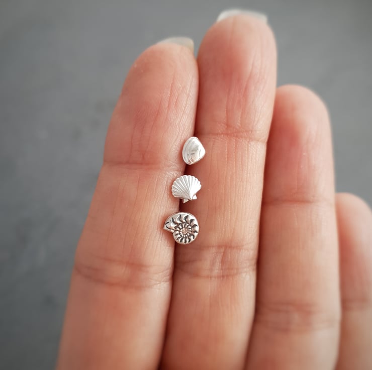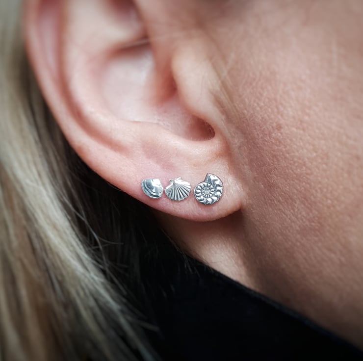 Each of these gorgeous little shells and ammonites is individually handcrafted in fine (99.99% pure) silver with a hypoallergenic sterling silver posts and scrolls. It takes a couple of hours to make just one stud. I make them in my workshop using traditional silversmithing techniques. Polished to a lovely shiny finish. Additionally the ammonite is oxidised to bring out its lovely pattern and texture.