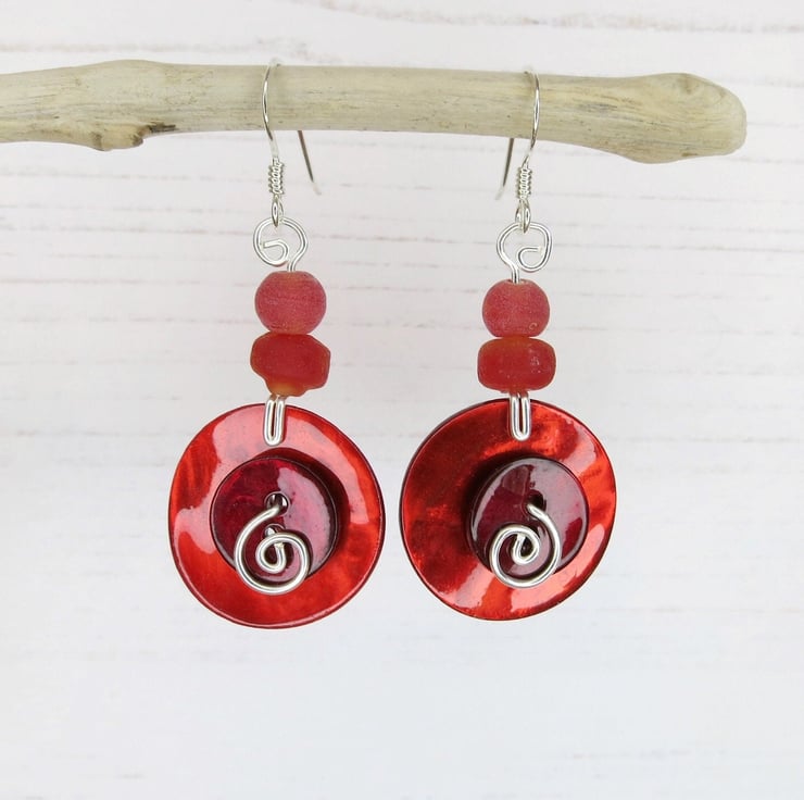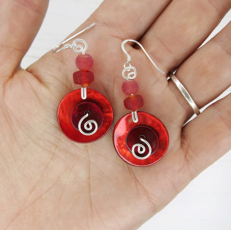 Shell button earrings, with frosted glass beads, silver plated wire and sterling silver stems.