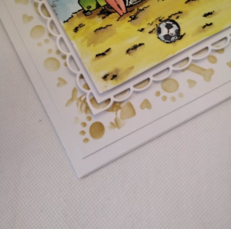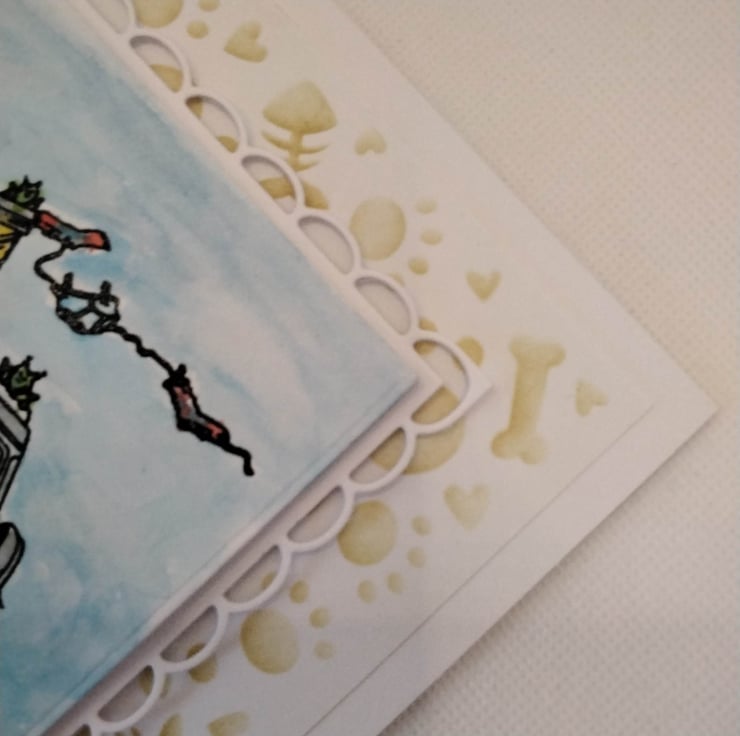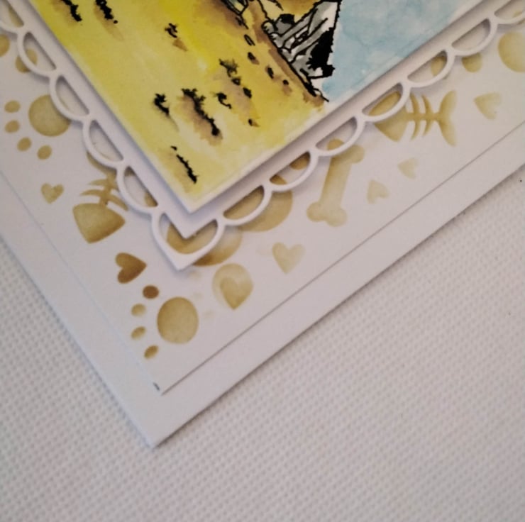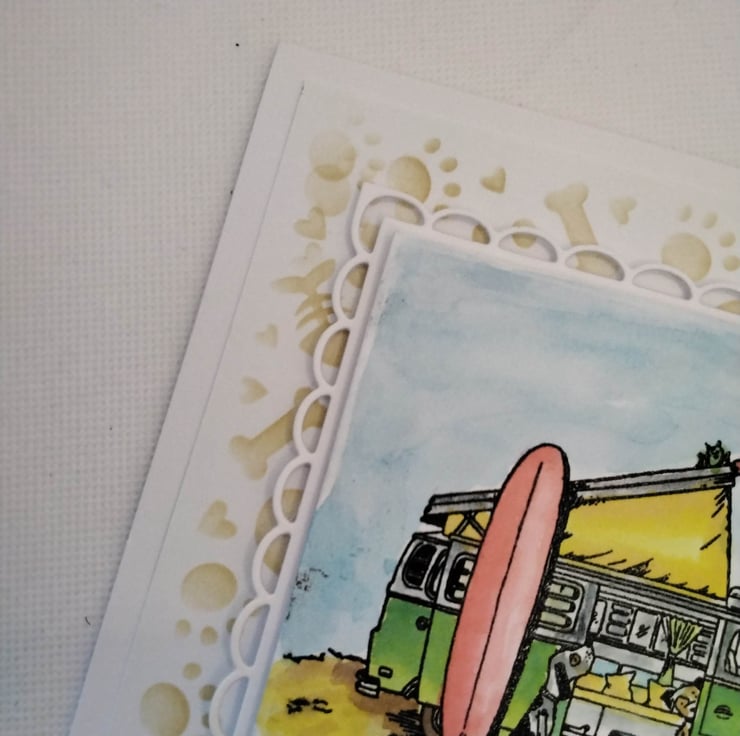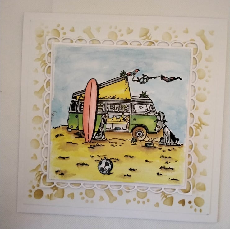 Hand made, unique, personalized celebration card, suitable for birthdays, Father's, Mother's day, ect, 300gsm card base, with envelope. 7" x7" square card. This card features, a stenciled background of paw prints, bones, Hearts and bouncy balls, topped with a scalloped edge square topper, with a hand stamped/coloured image of a beach scene, with a Campervan, top up, with a washing line if socks and underwear, blowing in the wind. The doors are open, inside a dog is peeking out at two of his friends, who are watching the antics of three mischievous frogs, there is also a surf board leaning against the side of the van. Personalization is free of charge ( occasion, recipient, number/age) please contact me to discuss the options, please check spelling and punctuation, many thanks Karen