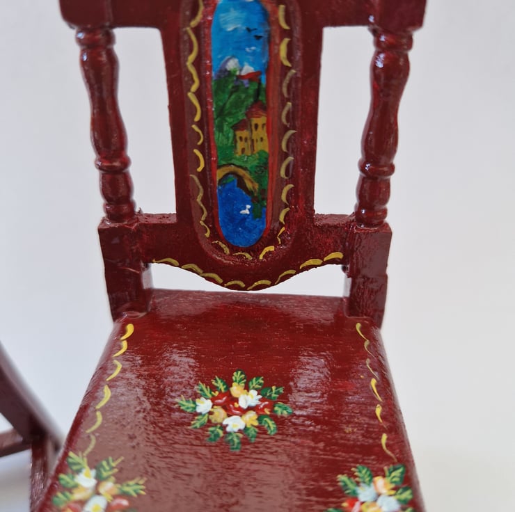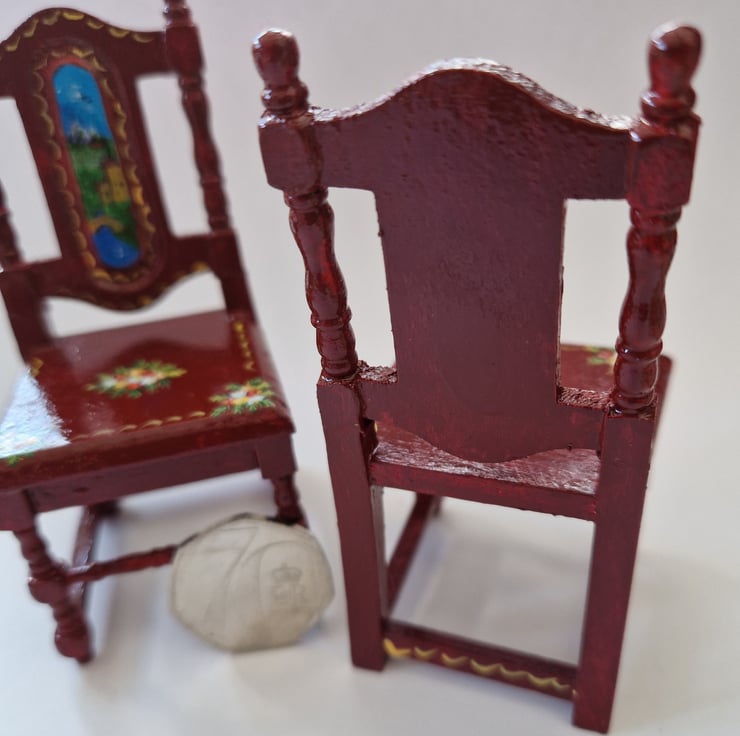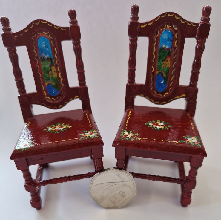 The wooden chairs are handpainted and would be ideal in your Dollshouse/Room box. Background colour is Burgundy.