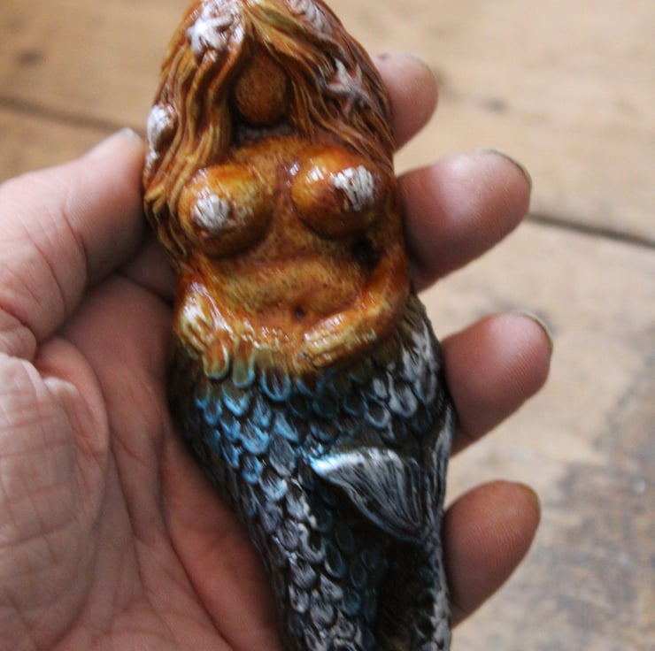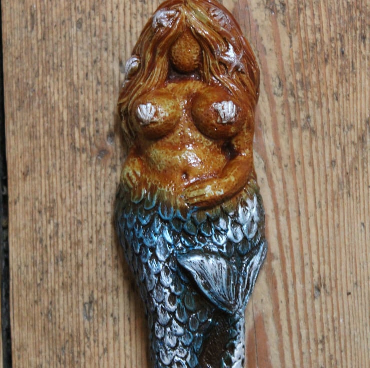 Hand made plaque, from our own sculpture of an ample Mermaid posing ! She is finished in green, blue paint and silver gild, with a waterproof coating. There is a loop embedded in the back to enable her to be placed anywhere.