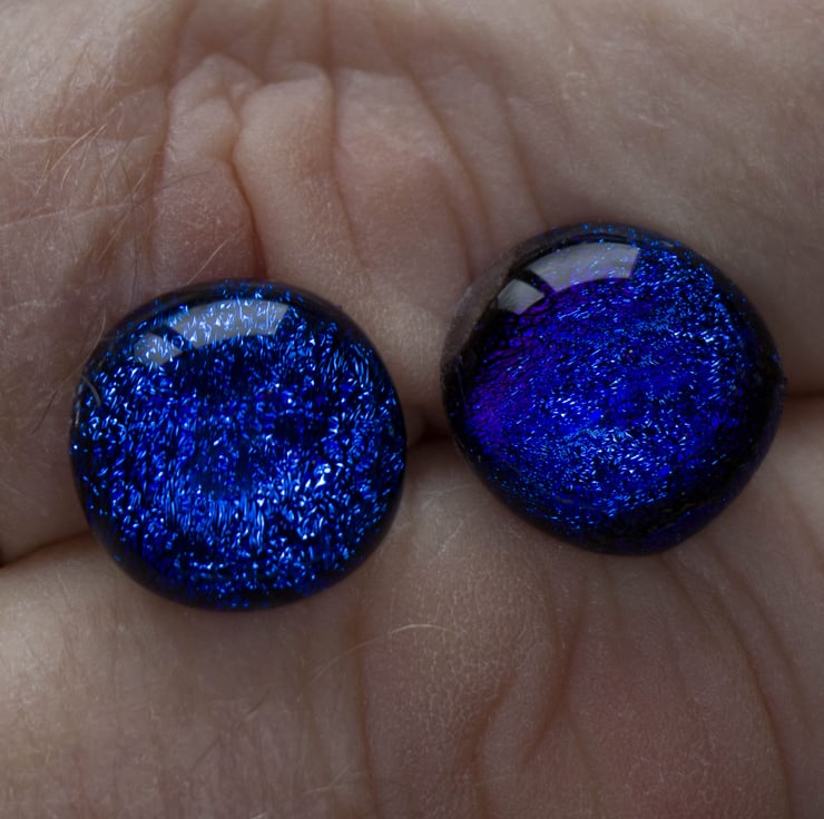 We have a range of earrings created from dichroic glass - we love working with it. The colours that Dichroic Glass show continues to amaze and surprise us. When we open the kiln we are always looking to see what the kiln-fairies have been up to.