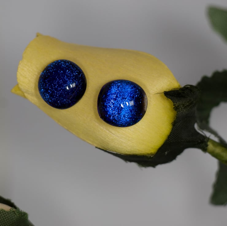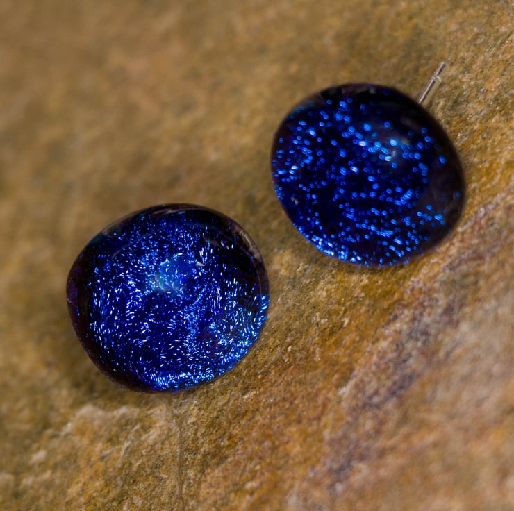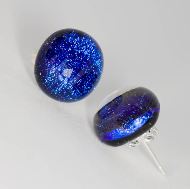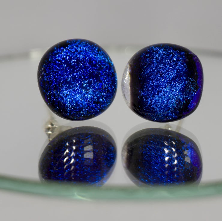 Each earring is a rounded square that measures approximately 1.3 cm across and is made from hand-cut glass which has been fused at around 800C in our kiln. This process creates a totally smooth surface.