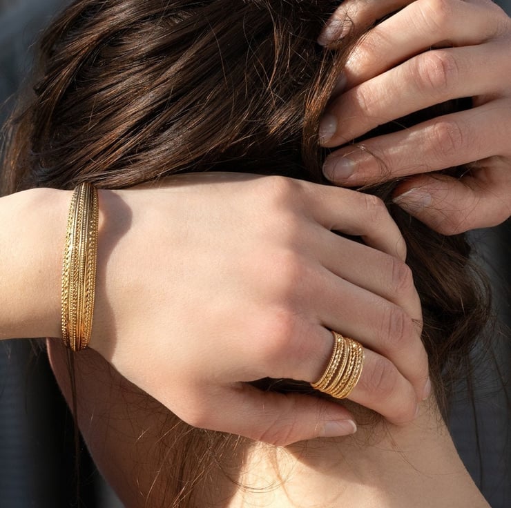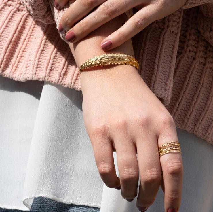 We were inspired by the desire to create a luxury bangle that combines the richness of 18ct gold vermeil with a textured design, offering both elegance and adjustability. This bangle is a testament to our commitment to crafting fine jewellery that enhances the beauty of those who wear it.