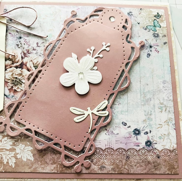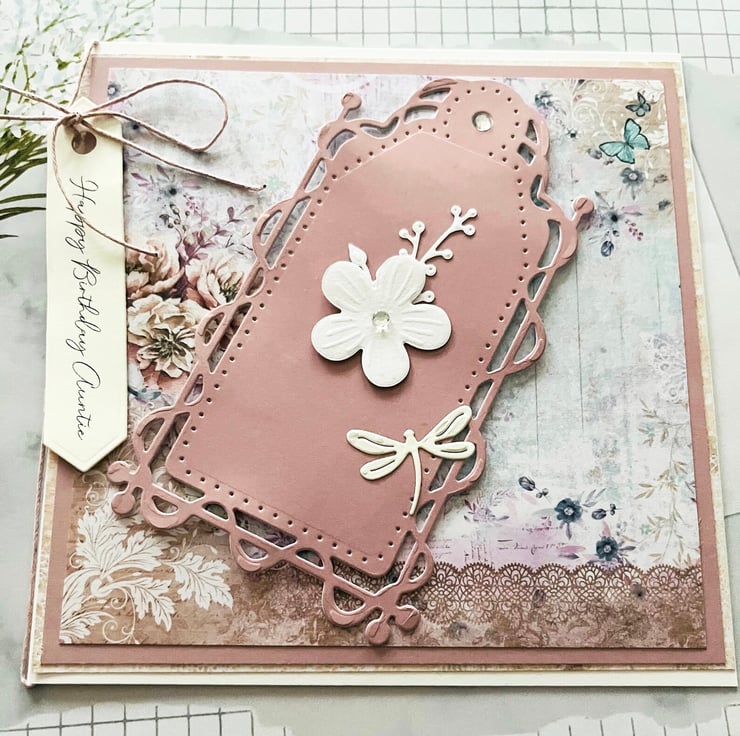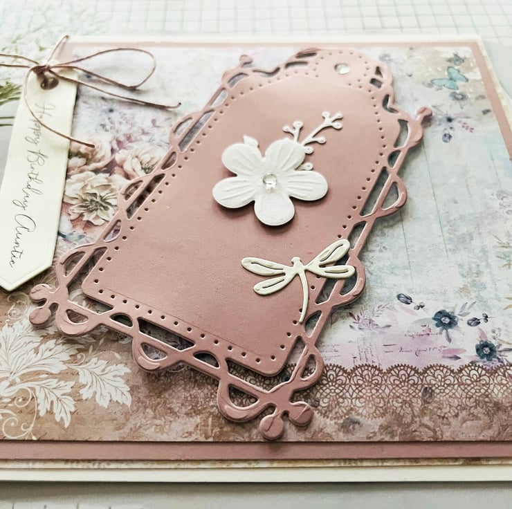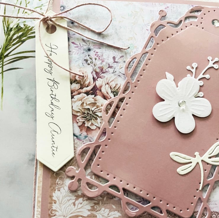 A lovely card in a colourful vintage design, it features a ornate tag with flowers and dragonfly, a tag with Happy birthday Auntie held in place with pink cord, this card is a unique design for that special auntie of yours, this card is a perfect keepsake of this occasion