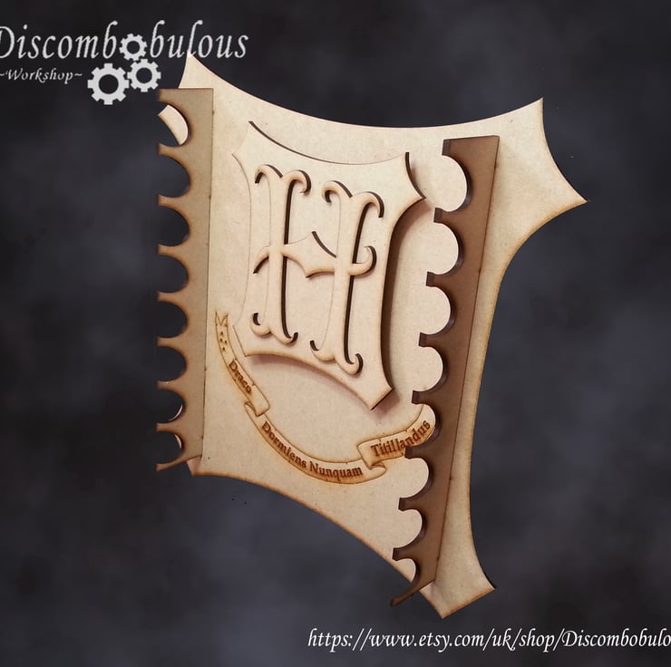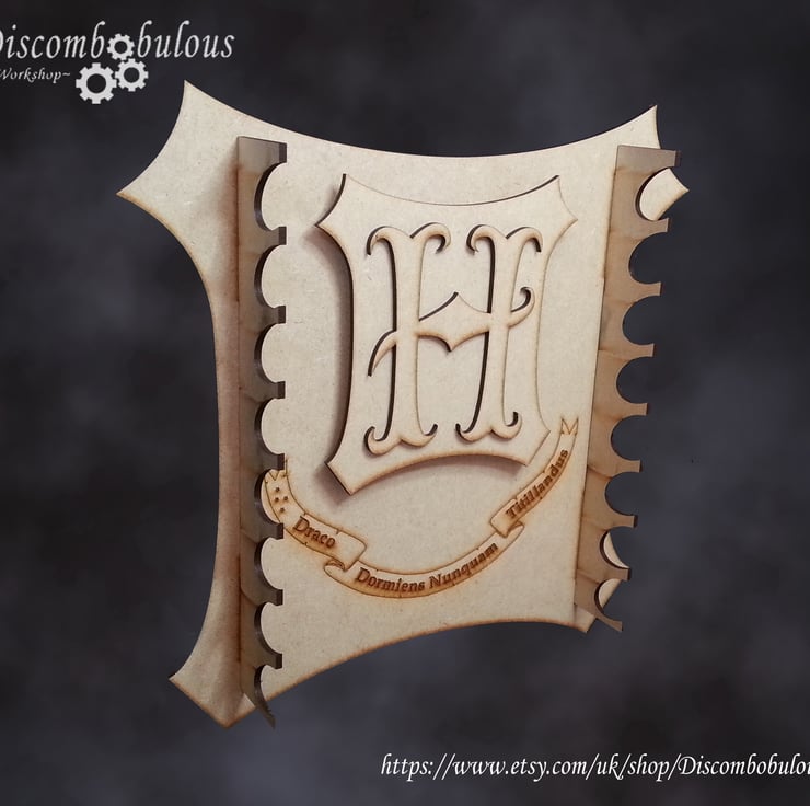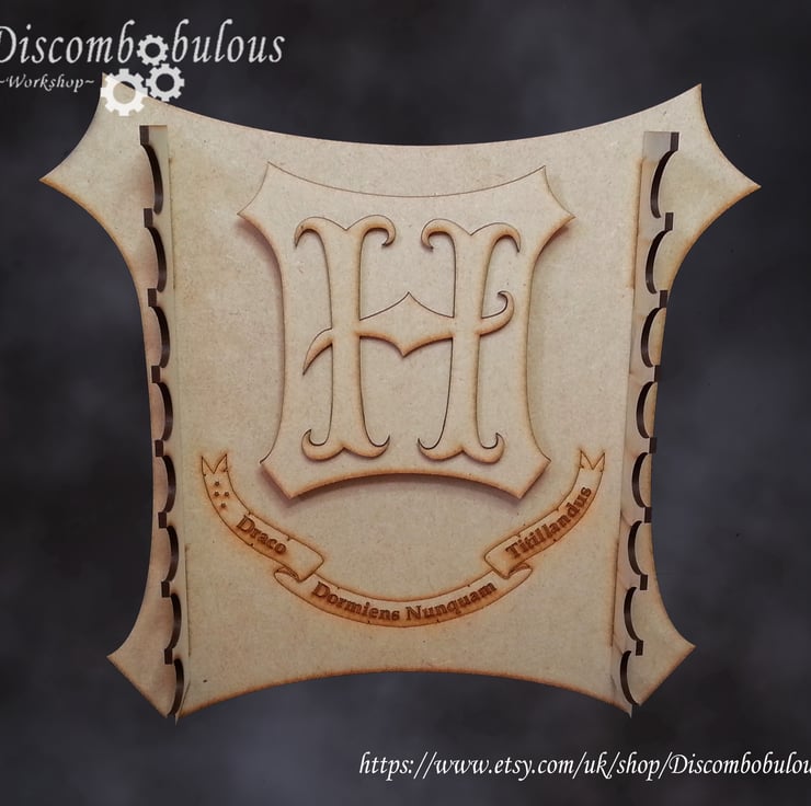 Made from 3mm thick laser cut MDF and measuring 11" x 11.5" (at the widest points), it sports a 'H' on the front, as well as the motto 'Draco Dormiens Nunquam Titillandus".
