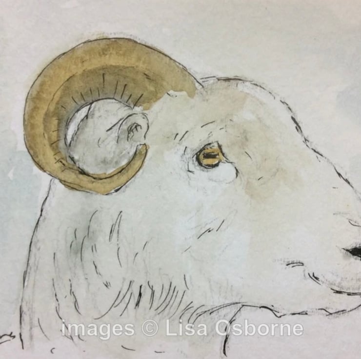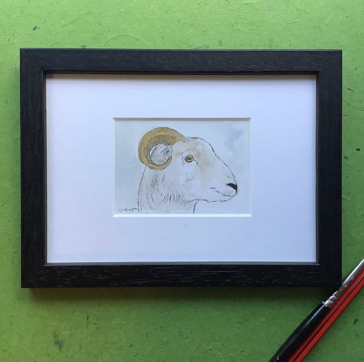 Sheep - original miniature watercolour, pen, ink and pencil of a ram in a simple black frame..