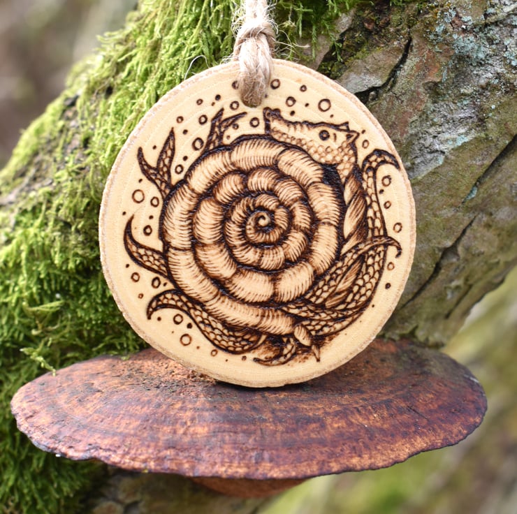 A beautiful wood burned decoration for the home with a swirly sea creature, in an ammonite like shell. There are some bubbles in the background.