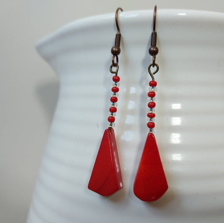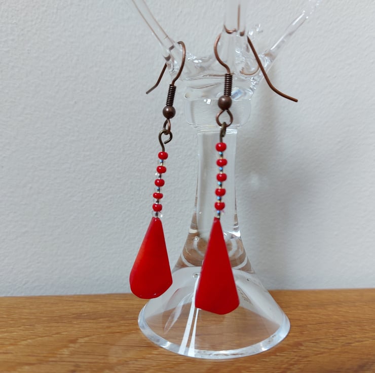 These brightly coloured earrings are fun to wear and sure to attract attention. Their focal point is a coral bead about 2cm long, dyed bright red and roughly triangular in shape. To add sparkle I have included ten seed beads, alternating red and silver in colour. The head pins and ear wires are of copper-coloured metal. The drop below the hook is 4cm.