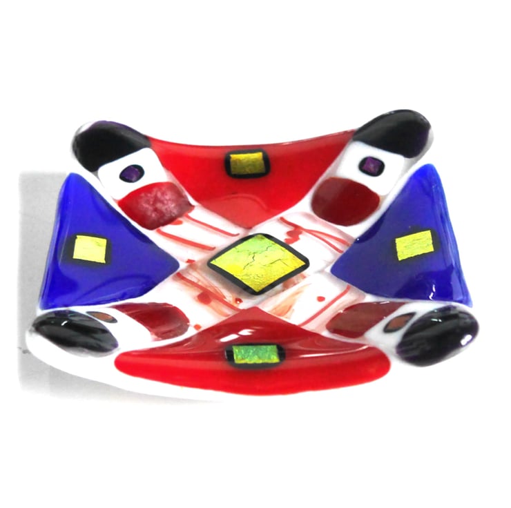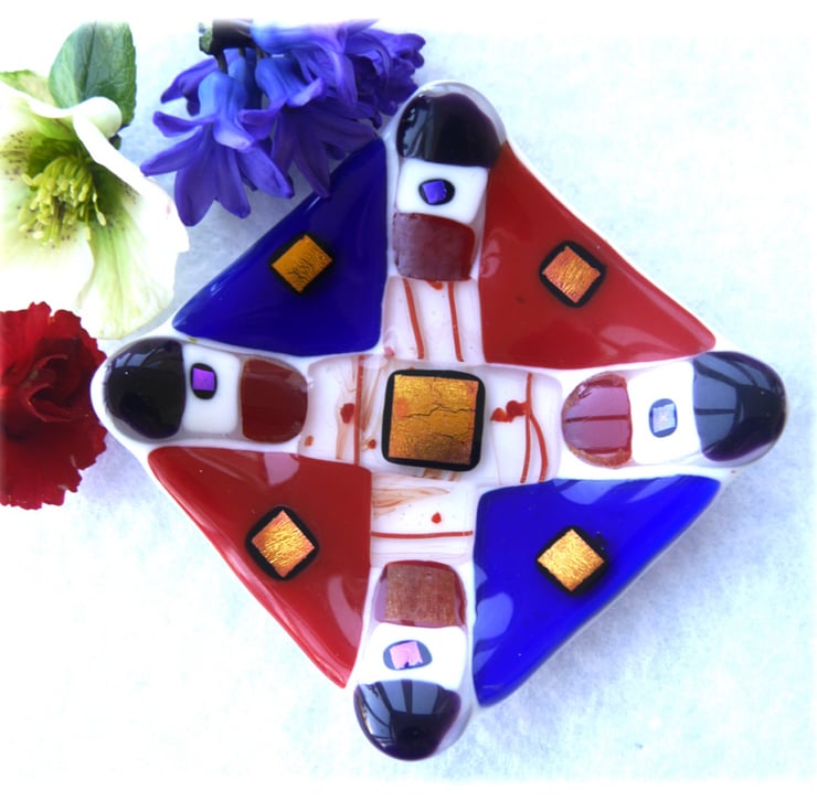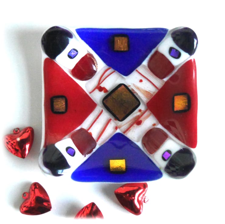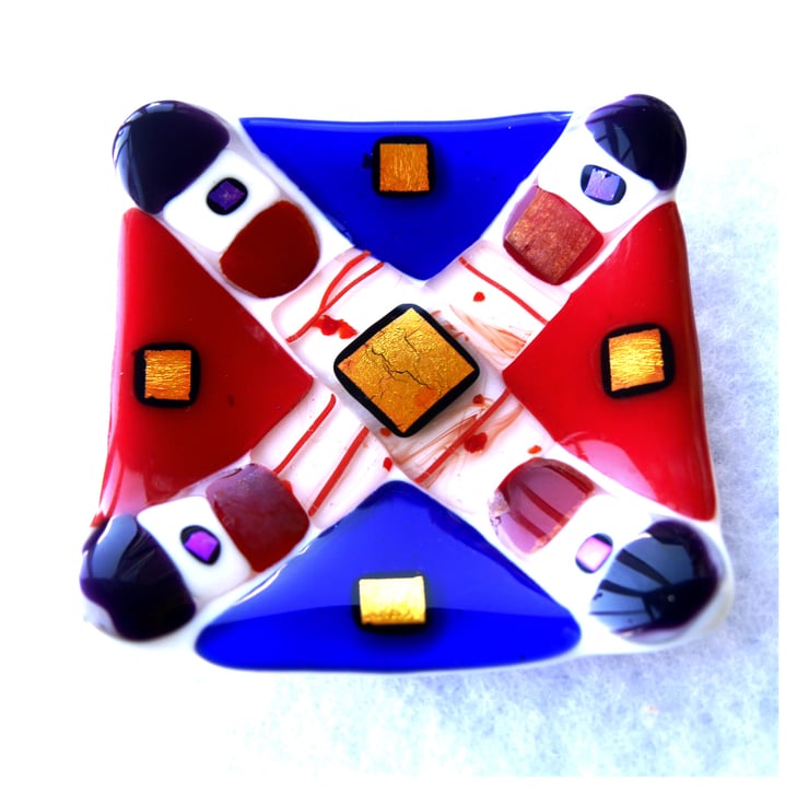 I made this by stacking the red and blue glass on top of a layer of bright opaque white. I've then added some gorgeous nuggets on the corners and infilled with some clear red streaked glass. Then to finish it with a flourish I've added some gorgeous golden red dichroic glass to make it really special.