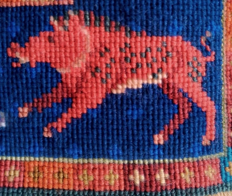 This is decorated with wild boars, rabbits, wild geese and a hawk. A lion leaps at each top corner.