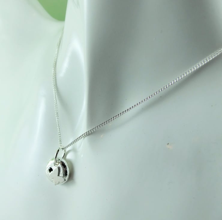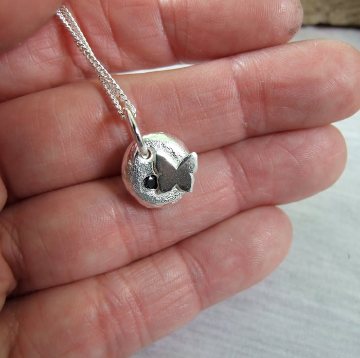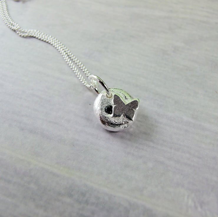 I have created the silver nugget from recycled silver heated to melting point when it forms a natural pebble shape, then once cooled slightly flattened on the top and added the loop to hang. I then soldered on a tiny butterfly and set the tiny 2mm faceted sapphire gemstone. I created the texture on the pebble using a diamond tip hand tool and to give a sparkly finish. Fitted to an 18 inch sterling silver chain.