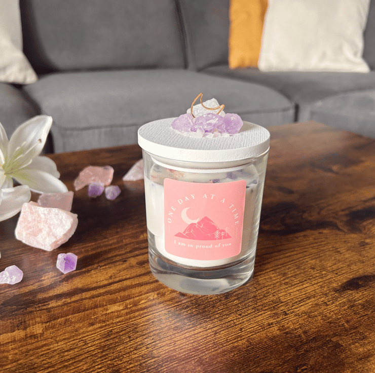 A homemade 30cl “one day at a time” candle, with decorative lid, with a jasmine fragrance.