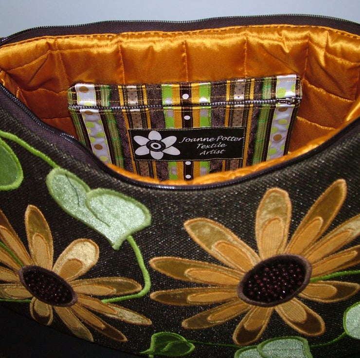 This Sunny Handbag features golden yellow velvet sunflower petals with a velvet brown center embellished with beads and sequins to give extra texture. the flowers are surrounded by a flowing green zig-zag stitched stem which has 5 green velvet leaves.
