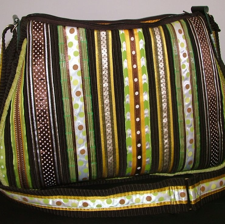 The back consists of many different patterns and textures and widths of ribbons of complimentary colors to create a vibrant and interesting panel.