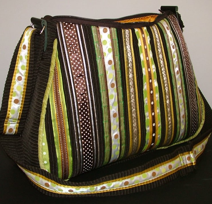 A soft green velvet surrounds the front and back panel connecting the ribbed brown sides, which has black leather strips with metal rings that attach the matching adjustable strap which is also decorated with ribbon.