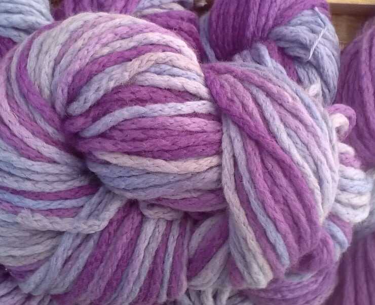 This super chunky hand dyed Merino is a beautifully soft chainette yarn. It would make amazing super cozy scarves, hats and wraps.
