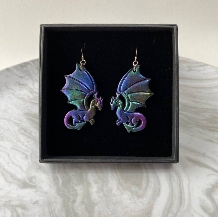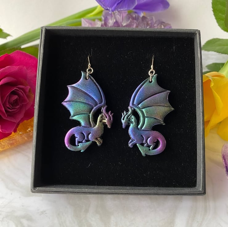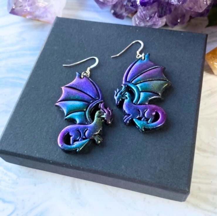 This listing is for the dragon iridescent statement earrings only. Current making time 10 - 14 working days from time of ordering. Other colours are available from my shop as well as dragon brooches and dragon pendant.