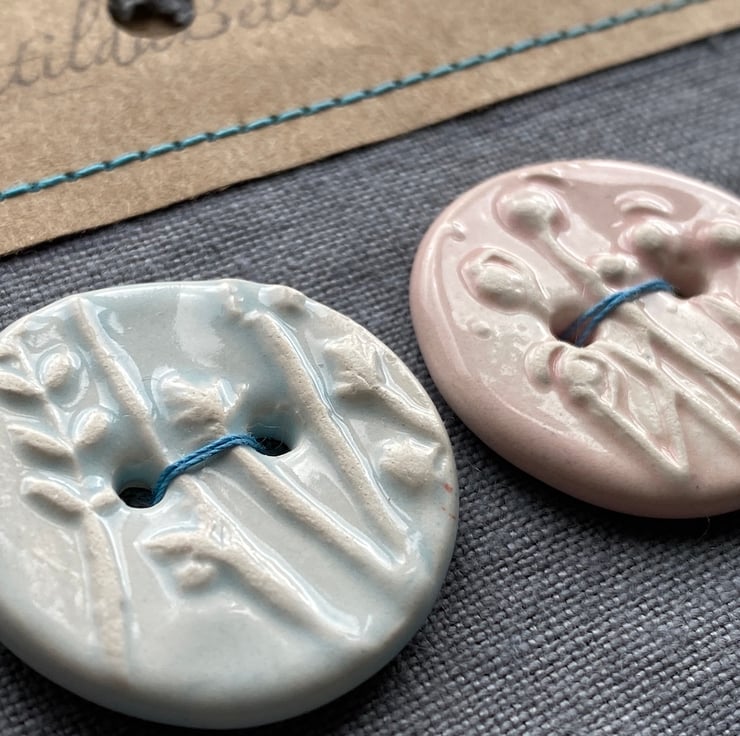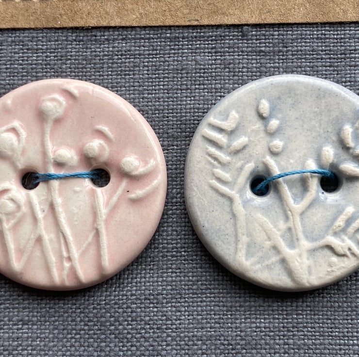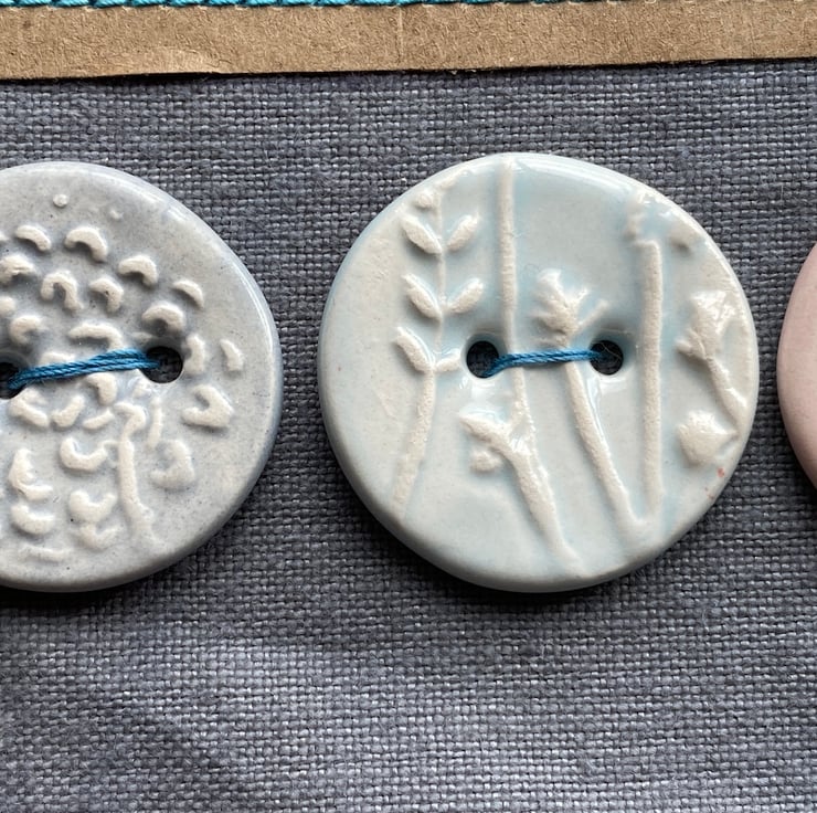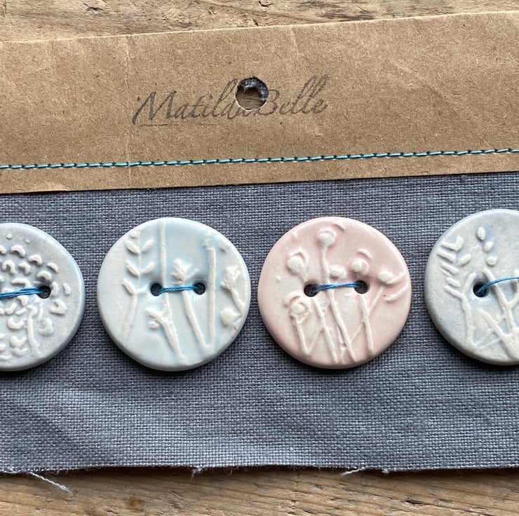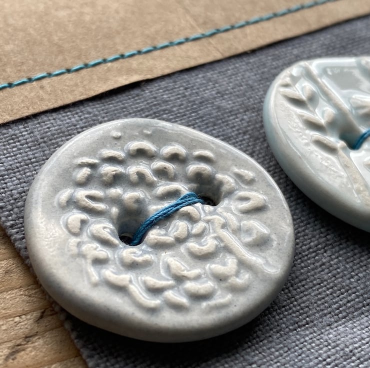 In my cozy studio overlooking a thriving herb garden, I found inspiration in the beauty of winter foliage and seeds. The herbs just outside my window compelled me to carve intricate designs, which I then carefully imprint onto the wet clay to create these buttons.