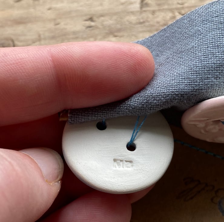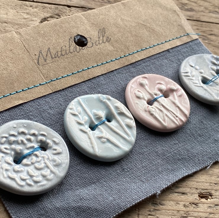 The front of each button is adorned with a glaze in calming pastel shades of Blue, Grey, Mauve, and Rose Pink, perfectly harmonizing with each other. On the reverse side, the buttons remain unglazed, showcasing the natural, smooth texture of the clay, complete with the discreet MatildaBelle maker's mark.