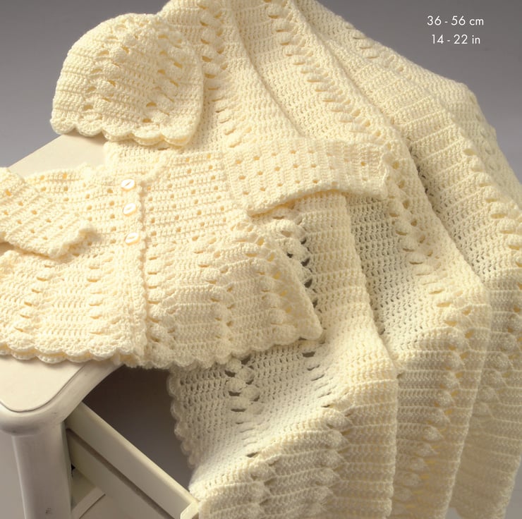 Crochet instructions for a Babies Coat, Shawl and Hat are included in this King Cole Double Knit Crochet Pattern.
