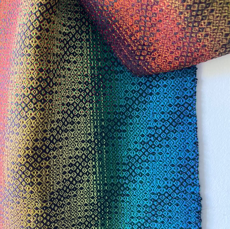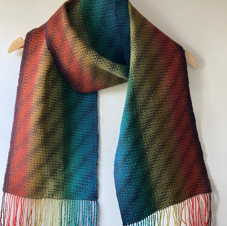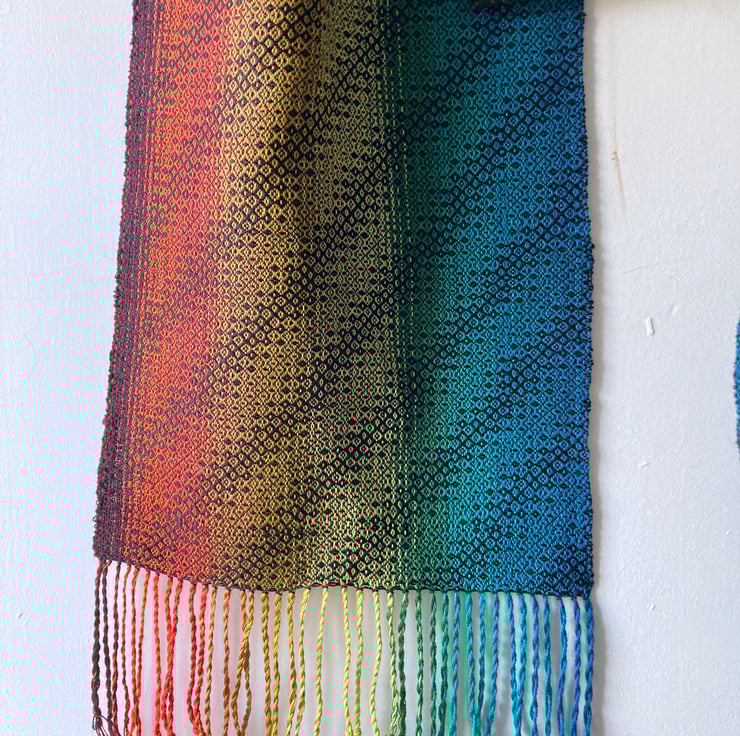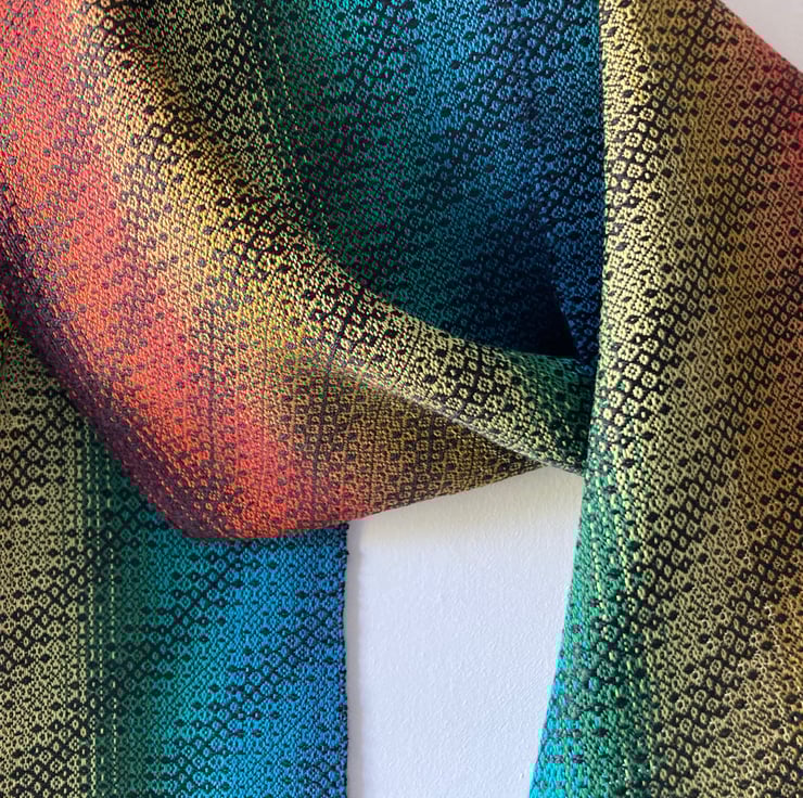 Handwoven in 11 shades of very fine cotton warped in a Fibonacci gradient. Gently shifting from teal through turquoise and green, to lighter shades of gold and orange. The scarf plays with colour and light when wound around the neck creating dramatic shifts in light and dark. Woven in a fine black silk weft in a tiny and intricate advancing twill, the scarf rewards the eye with an areas of ever moving diamonds. Inspired by the flash of colour of a diving kingfisher in the River Wye, this is the perfect weight of scarf, and is great for people sensitive to wool and looking for a year round scarf. Silk and cotton are non itchy and naturally regulates temperature. Light, with a good drape.
