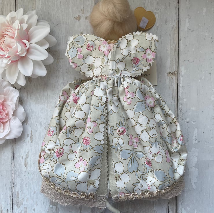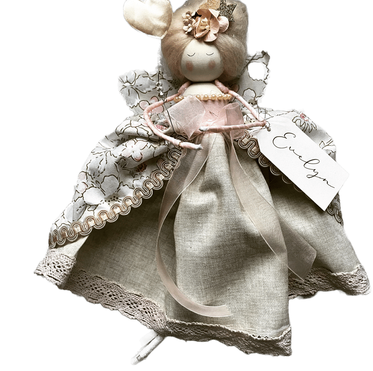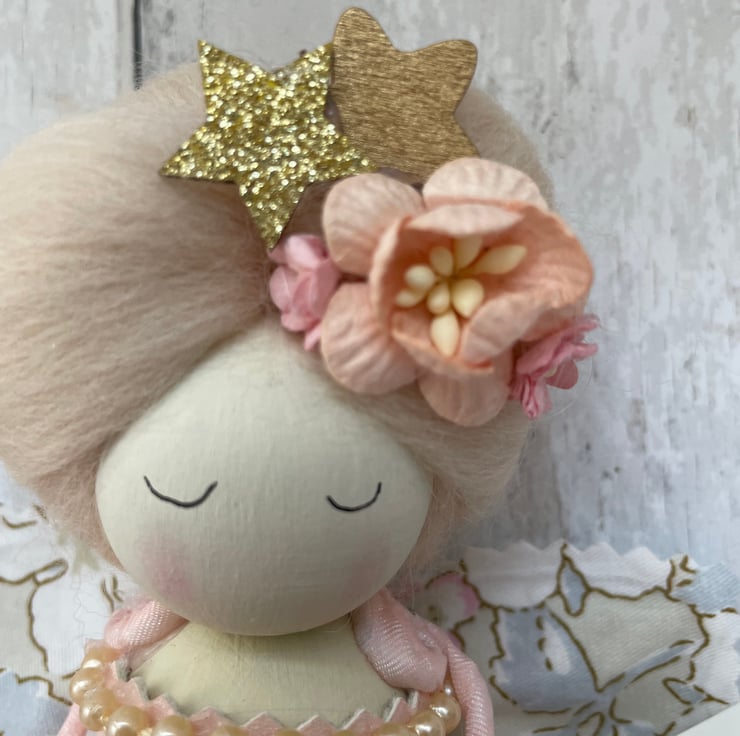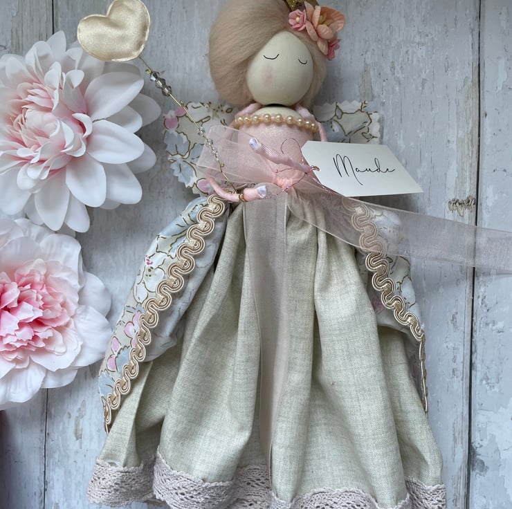 Pretty handmade unique fairy keepsake doll. She comes with an invisible stand which makes her perfect for a shelf or table top. She is approximately 40 cm tall. Opulence fairy comes with a beautiful name tag.