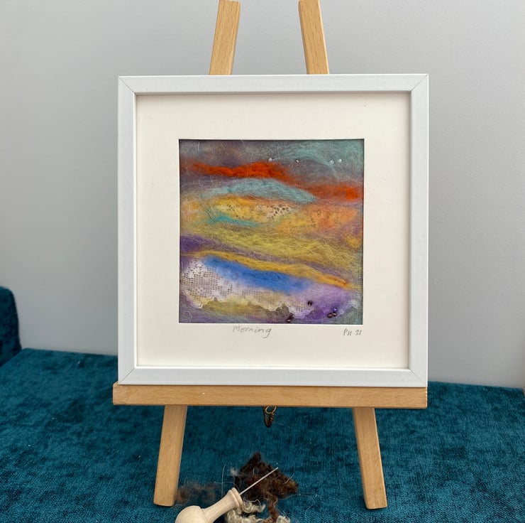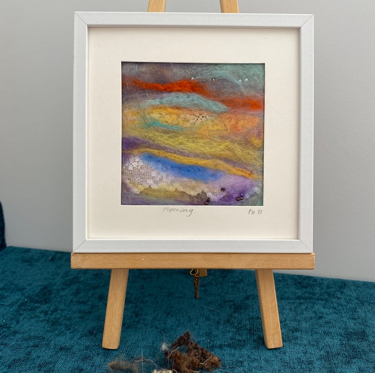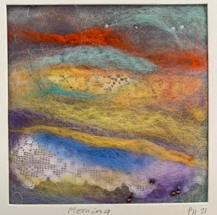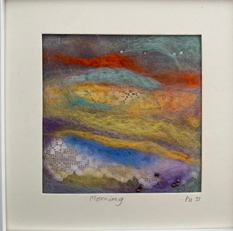 Inspired by the vivid colours of the morning sky, this abstract piece includes pieces of vintage lace embedded within the felting. tiny beads have been hand sewn on to add interest. A truly one of a kind piece which would make a perfect birthday gift for any occasion.