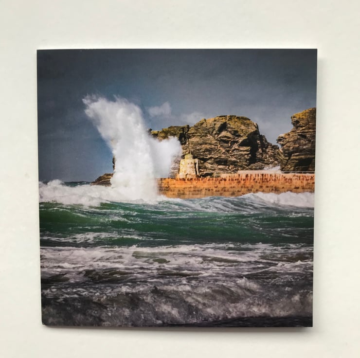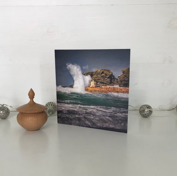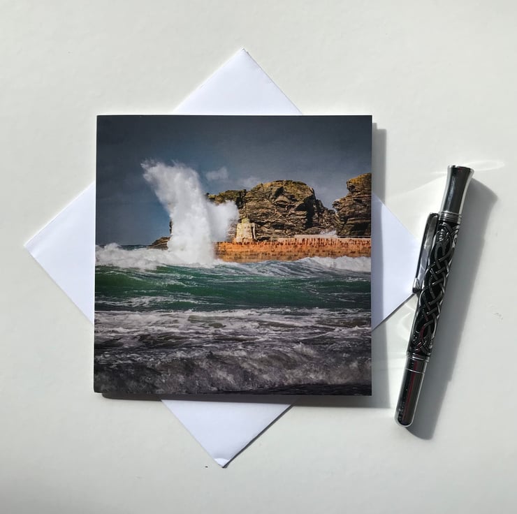 The photograph is of Portreath Harbour in North Cornwall with a stormy sea. The harbour is a great place to watch stormy waves.
