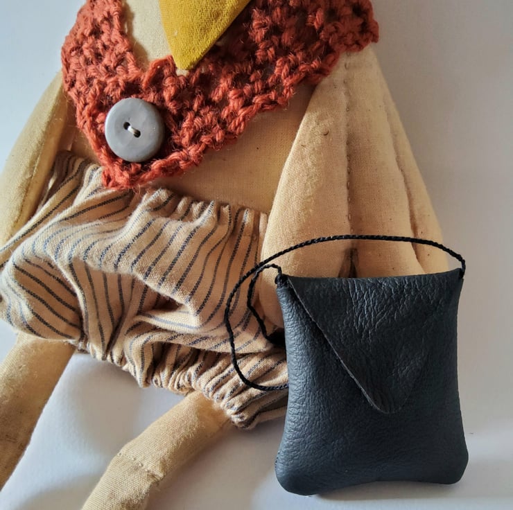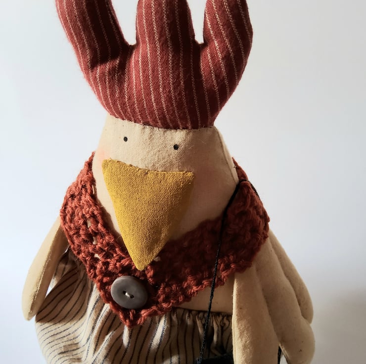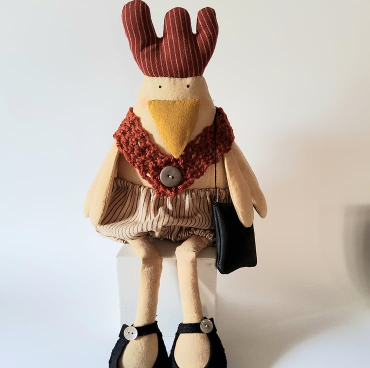 Primitive Chicken is made from tea dyed calico . Her comb is made from homespun fabric as are her bloomers. She has a hand crotched 100 % wool shawl ,finished with a big vintage button and she has a leather handbag in which she keeps some spare nesting material ( for emergencies- you just never know)! Her Mary Jane's are hand stitched felt ,finished with a mother of pearl button. She has been stuffed with wool which conforms to British standards. Her wings have been defined with hand stitching and her knee joints have been hand stitched.