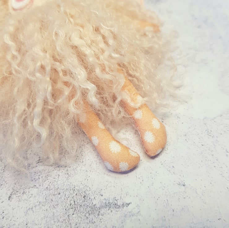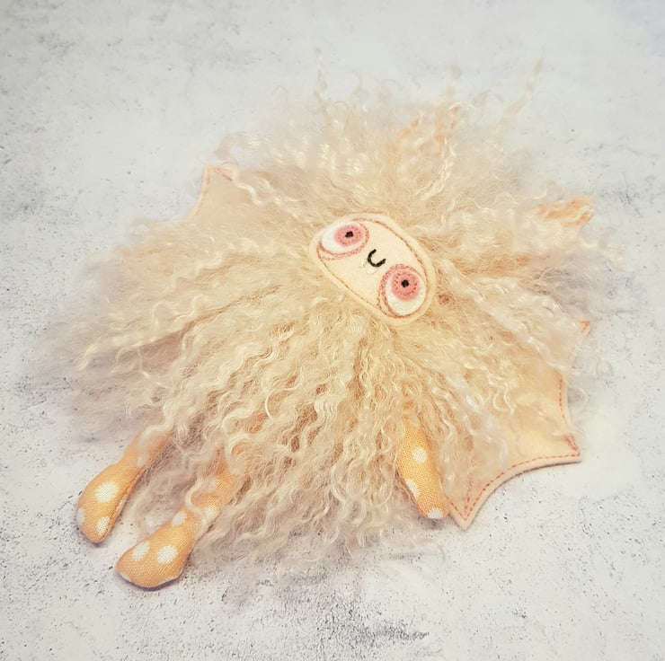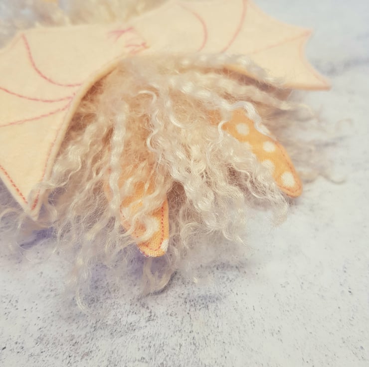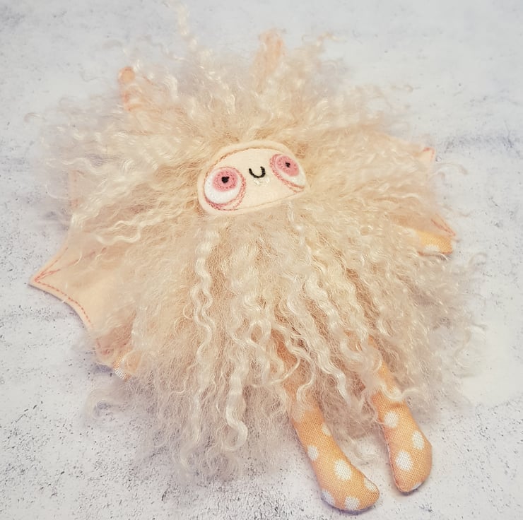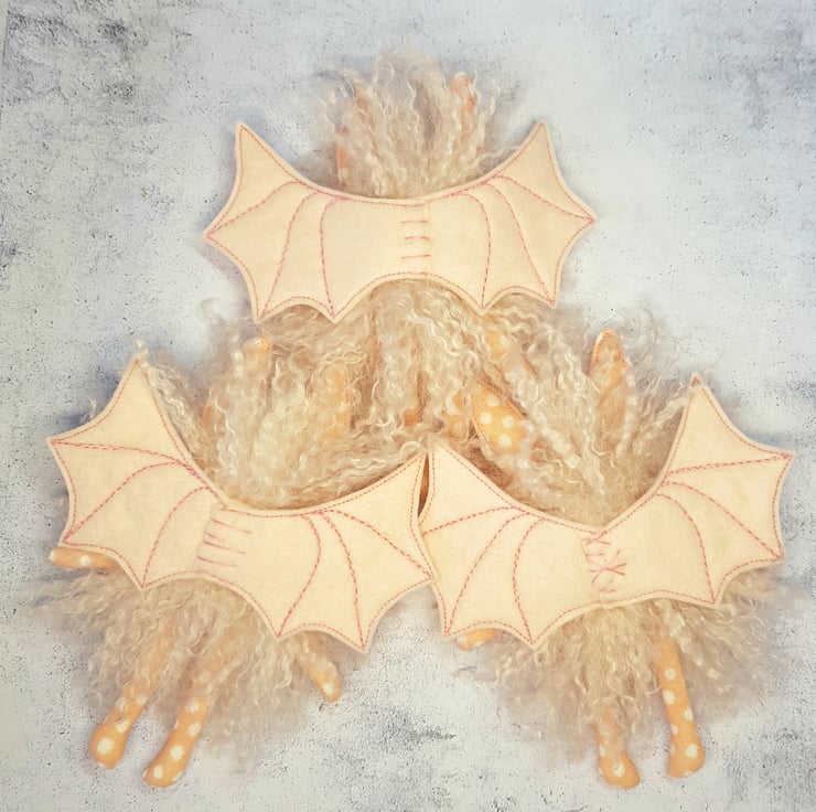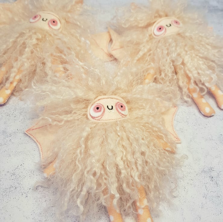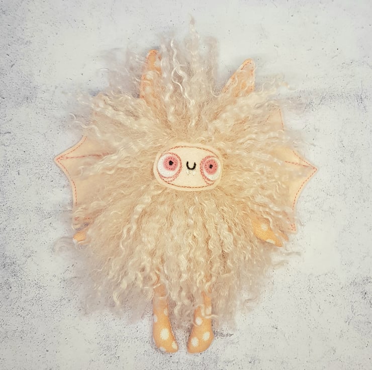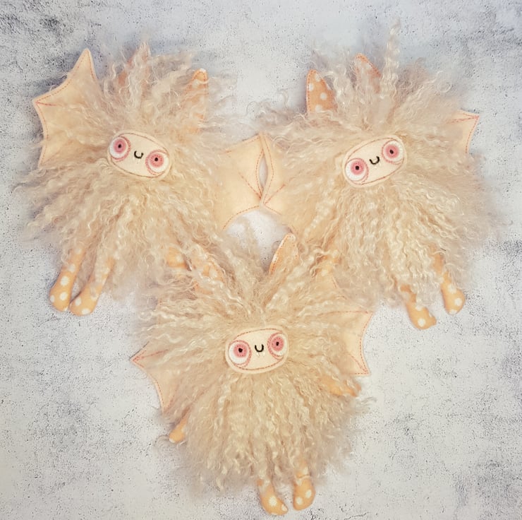 Bat made with luxuriously soft and curly faux fur. The face and wings are free motion embroidered on felt and the arms, legs and ears are made with polka dot print. This listing is for one bat. These are meant for decorative purposes only and not a toy. Bats come with transparent loop hanger attached.