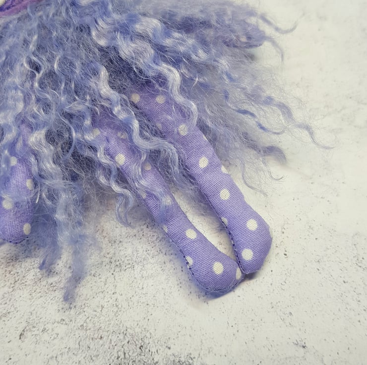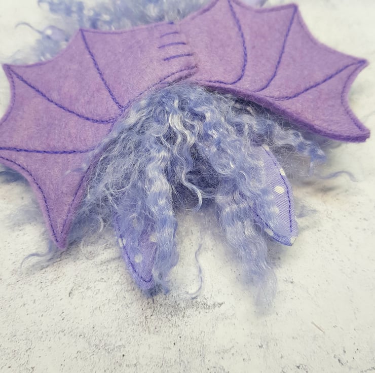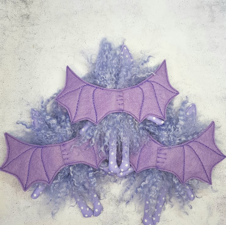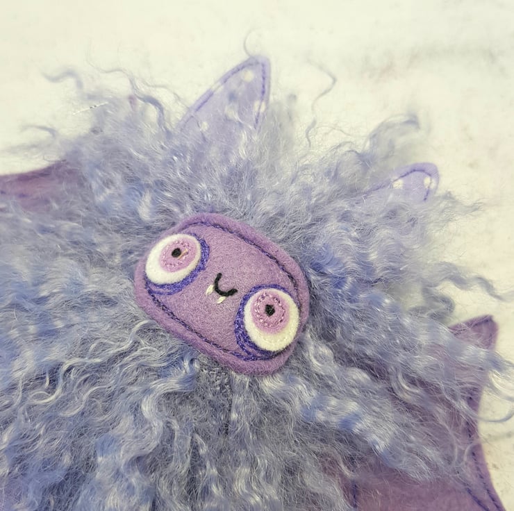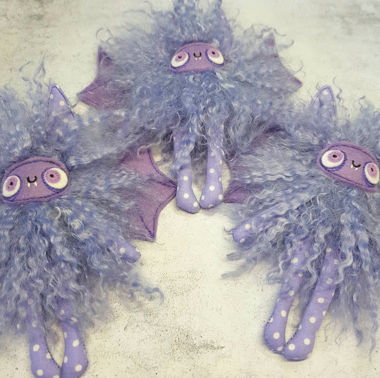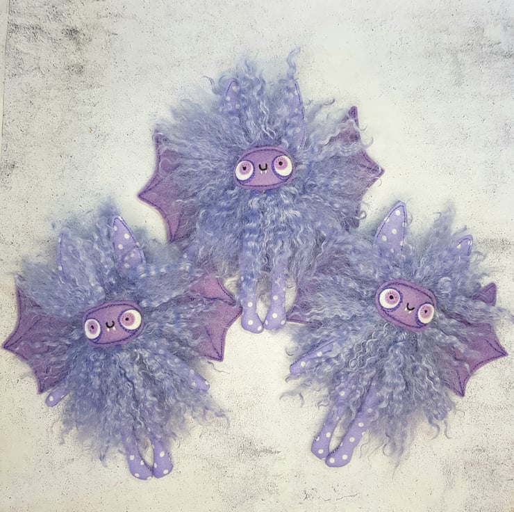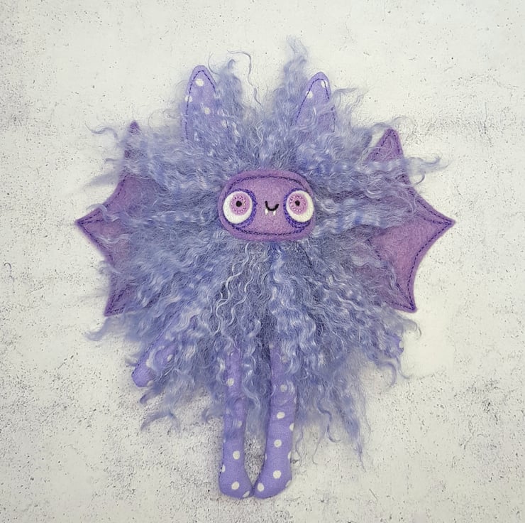 Bat made with luxuriously soft and curly faux fur. The face and wings are free motion embroidered on felt and the arms, legs and ears are made with polka dot print. This listing is for one bat. These are meant for decorative purposes only and not a toy. Bats come with transparent loop hanger attached.