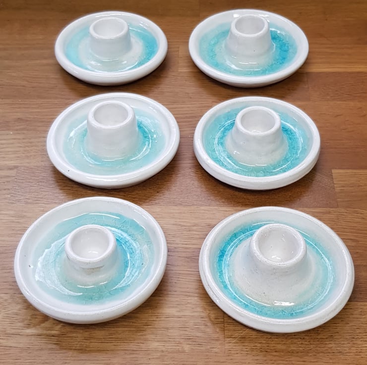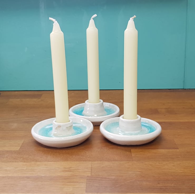 These hand thrown stoneware and sea glass candlesticks are part of the Rockpool Collection. They are elegant stoneware white glazed candlestick with a delicious pool of glass in the base. They are designed for standard candles and will enhance any home. I have been fascinated by rockpools since childhood and can never resist collected seaglass! They measure approximately 10 cms by 5cms.