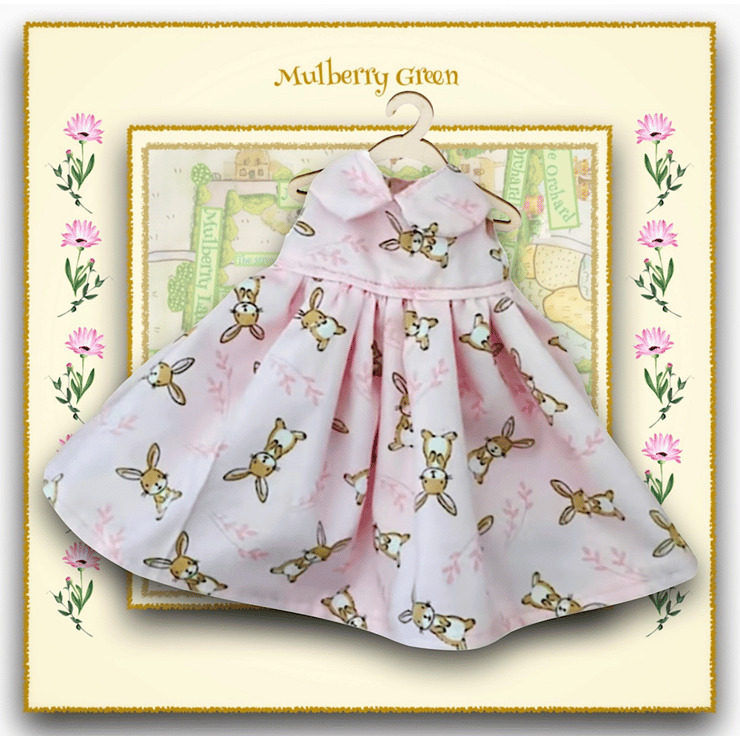 A lovely little pale pink dress in a bunnies to fit the Mulberry Green characters. The dress is made from best quality cotton, has a Peter Pan collar and a lined bodice.