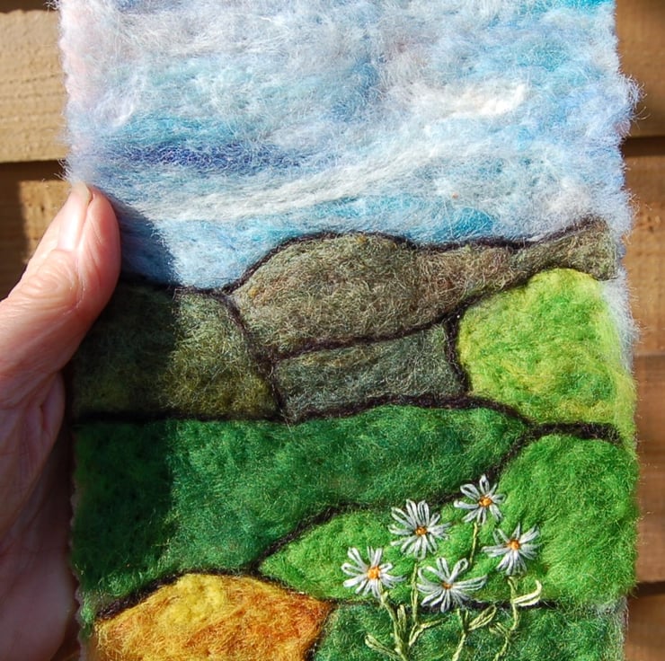 Hills and fields boldly outlined in black under a cloudy blue sky. Hand stitched daises.