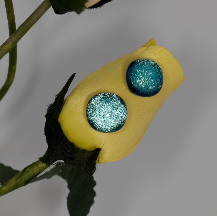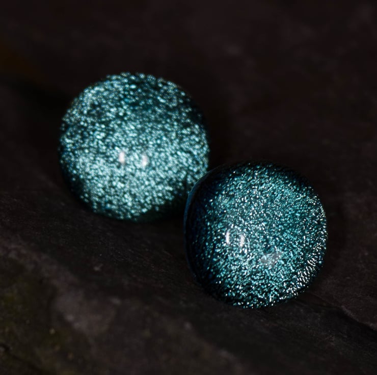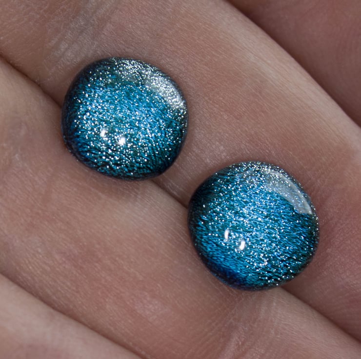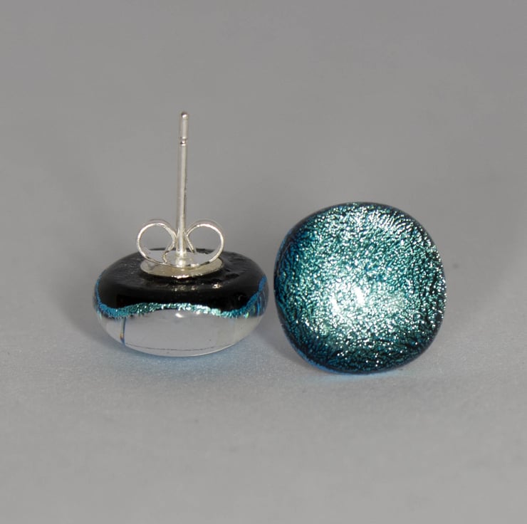 Each earring is a rounded square that measures approximately 1.3 cm across and is made from hand-cut glass which has been fused at around 800C in our kiln. This process creates a totally smooth surface. The Studs and Butterfly Backs are Sterling Silver. They will be shipped in a black presentation box.