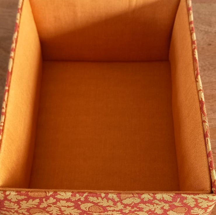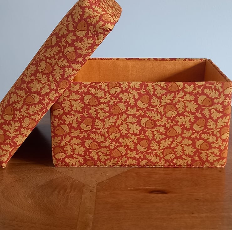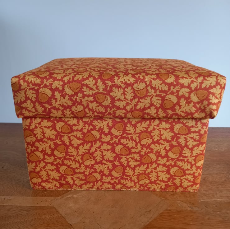 The exterior surfaces are covered with a pretty acorn patterned fabric and the interior surfaces are covered with plain gold coloured fabric. All fabrics are 100% cotton and all surfaces, apart from the base, are padded.