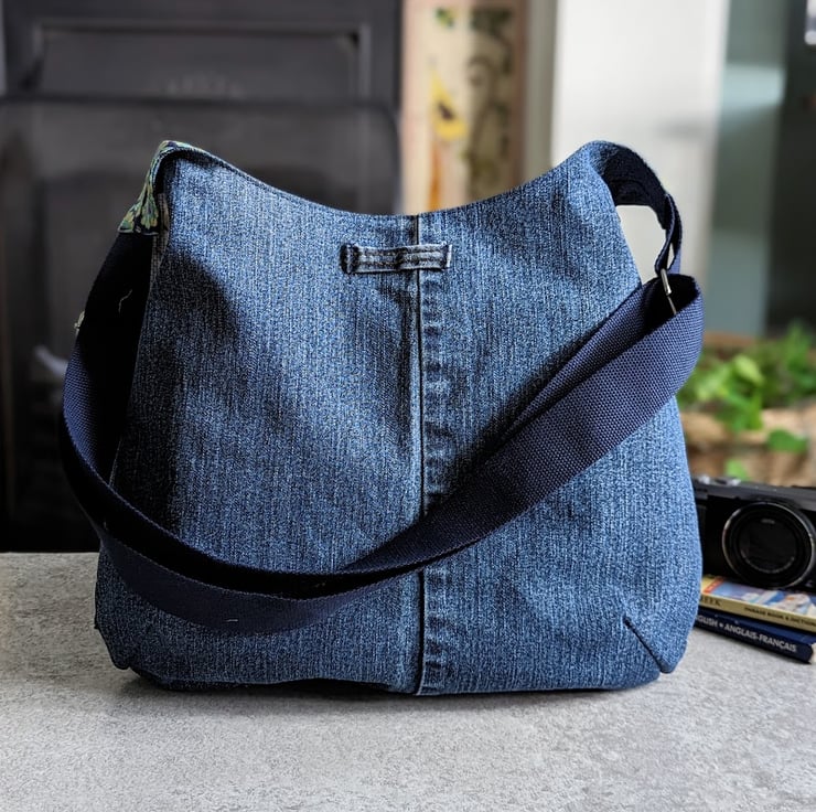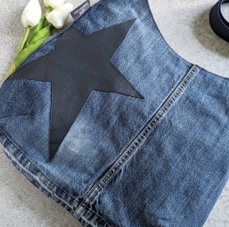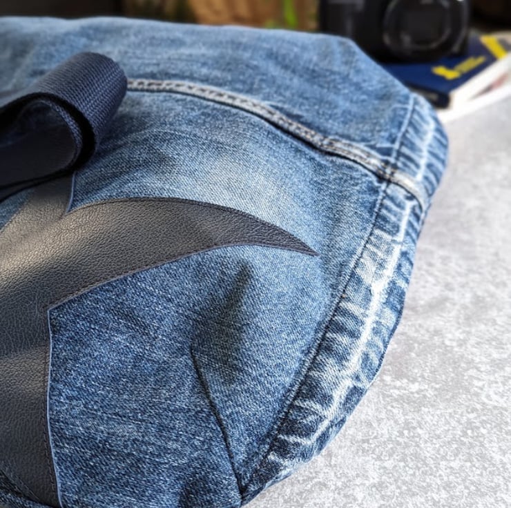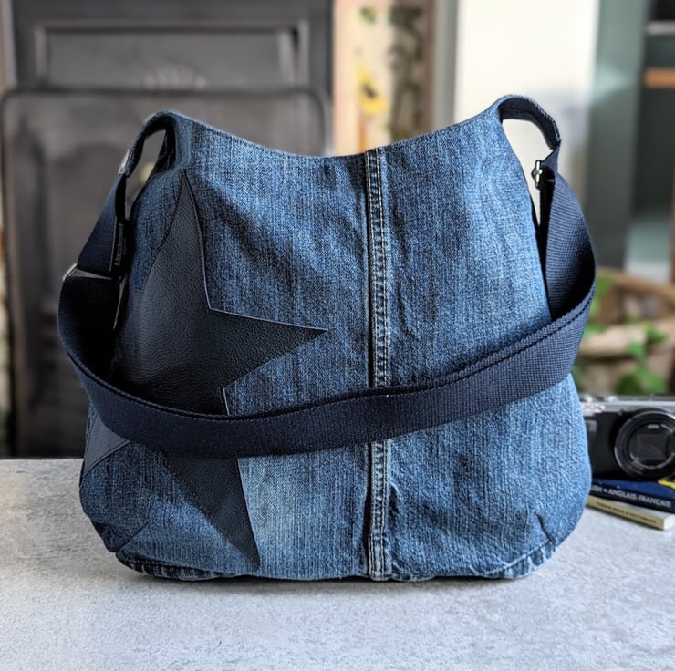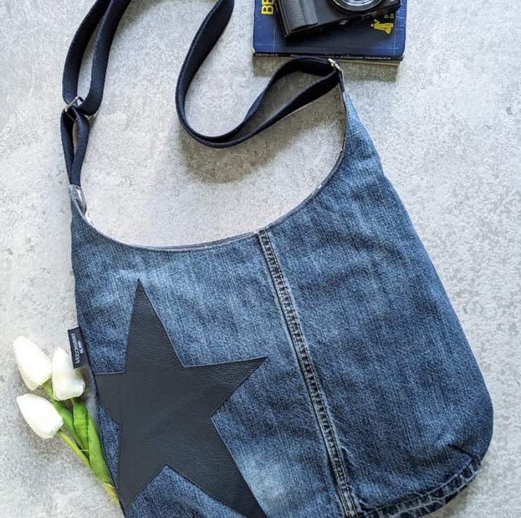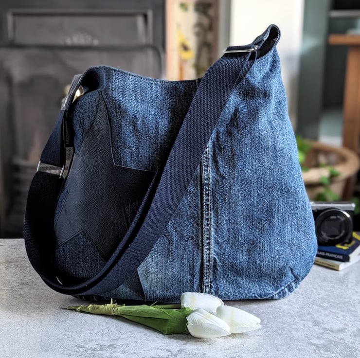 With a dark navy leather star, this recycled denim cross body bag would look great with any outfit. Designed and handmade using preloved denim jeans and off-cut leather pieces. Dress it up or dress it down, it’s slouchy and perfect for all your everyday essentials and more!