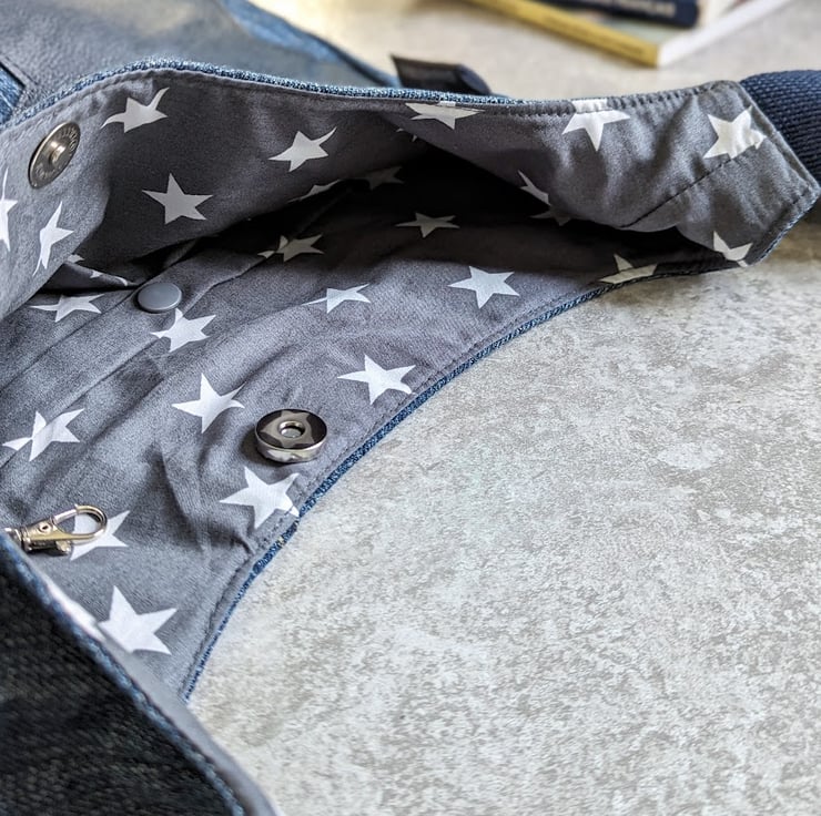 It has a grey star print print cotton lining. The cross body strap has been made from 38mm wide navy webbing.