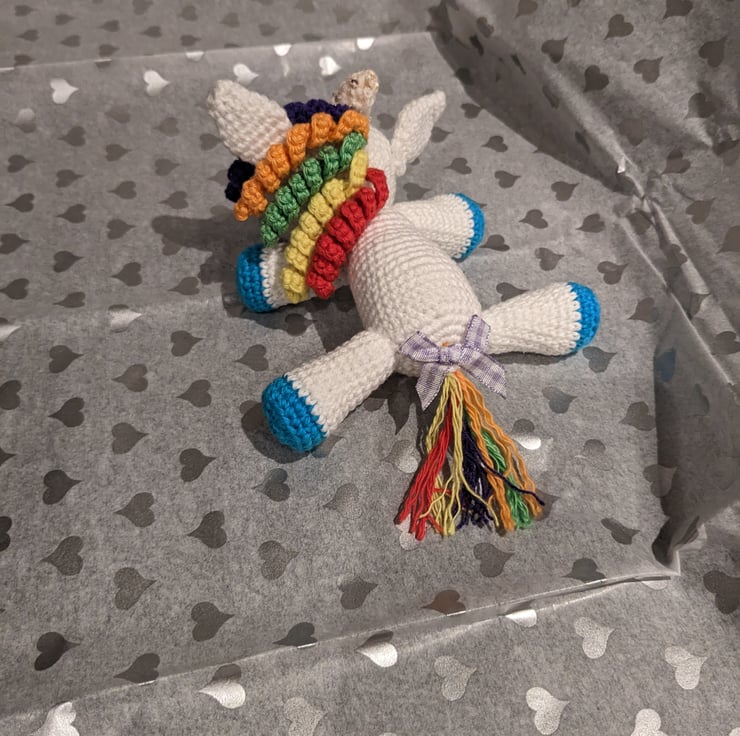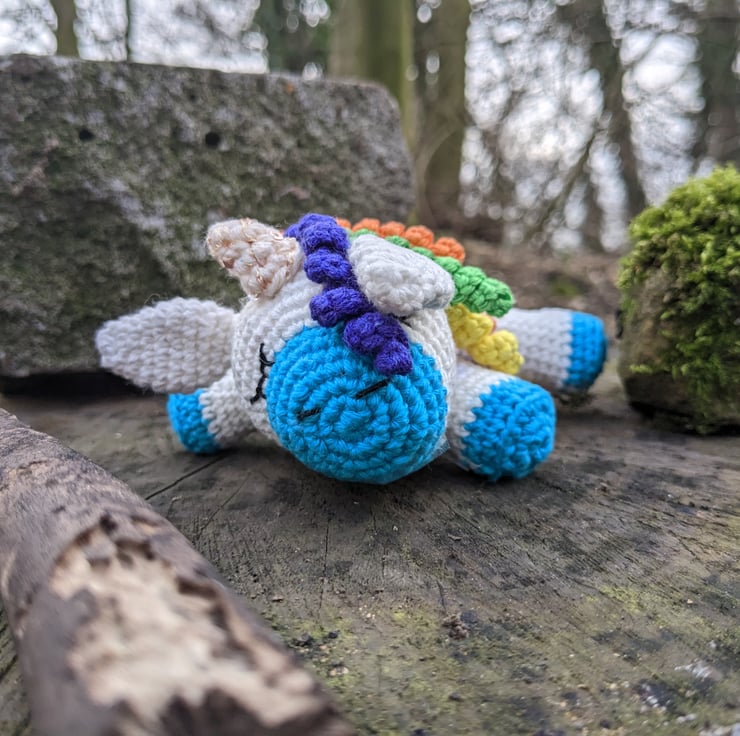 Hand crafted with love is this sweet little sleeping unicorn. Made with 100% cotton and stuffed with toy grade stuffing. Approx. 6 inches long. Rainbow coloured mane and tail (tail finished with a checked lilac bow) Ideal as a gift for both children and adults.