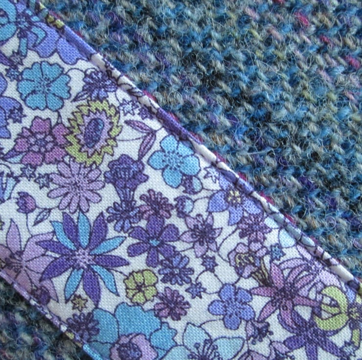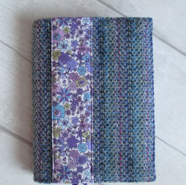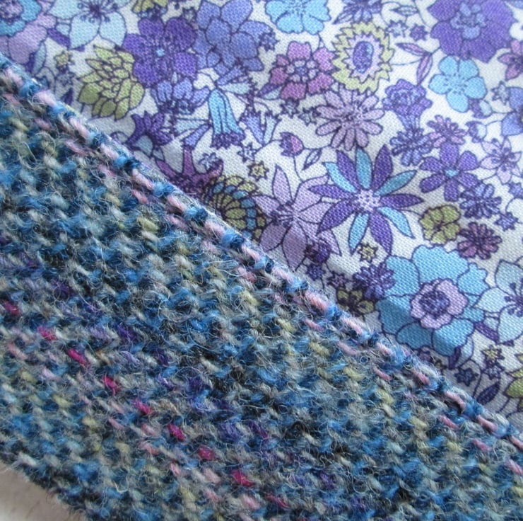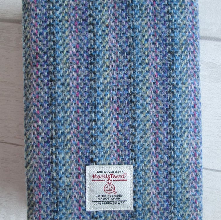For this notebook cover I've used one of A Harris Tweed Weaver's beautiful, handwoven tweeds in misty shades of blue, lilac and pink. Teamed with a coordinating floral print for lining and feature band, it incorporates a ribbon place marker and carries the 'Orb Mark' label on the back. Complete with a hardbacked lined notebook it's ready to use or wrap up as a gift for someone special.