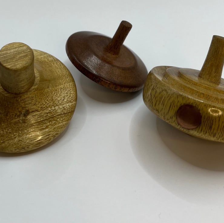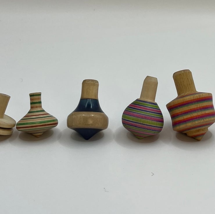 Handmade wooden spinning tops. A mixture of small and larger tops, some for smaller hands and some for larger! Do you have the skill to spin for the longest time?