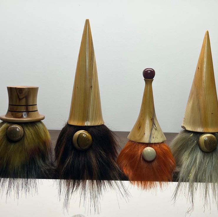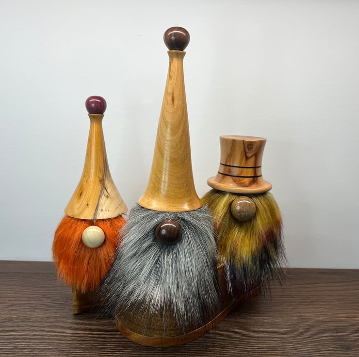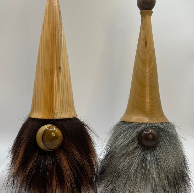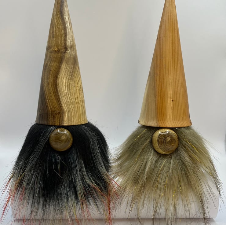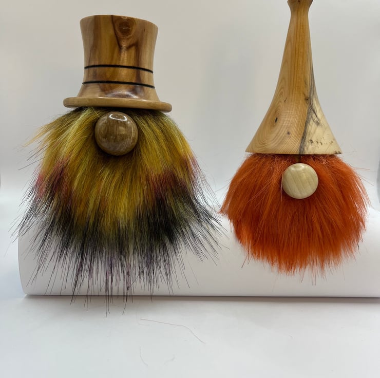 Handmade wooden Gonks. These cute little characters are made from different woods including Yew, Laburnum, Apple, Tulip, Oak, Walnut and Purple Heart.